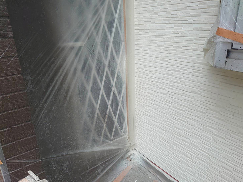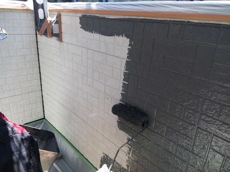 下地のひび割れ補修を行ったうえで、専用の下塗り・中塗り・多彩模様材を順に施工。